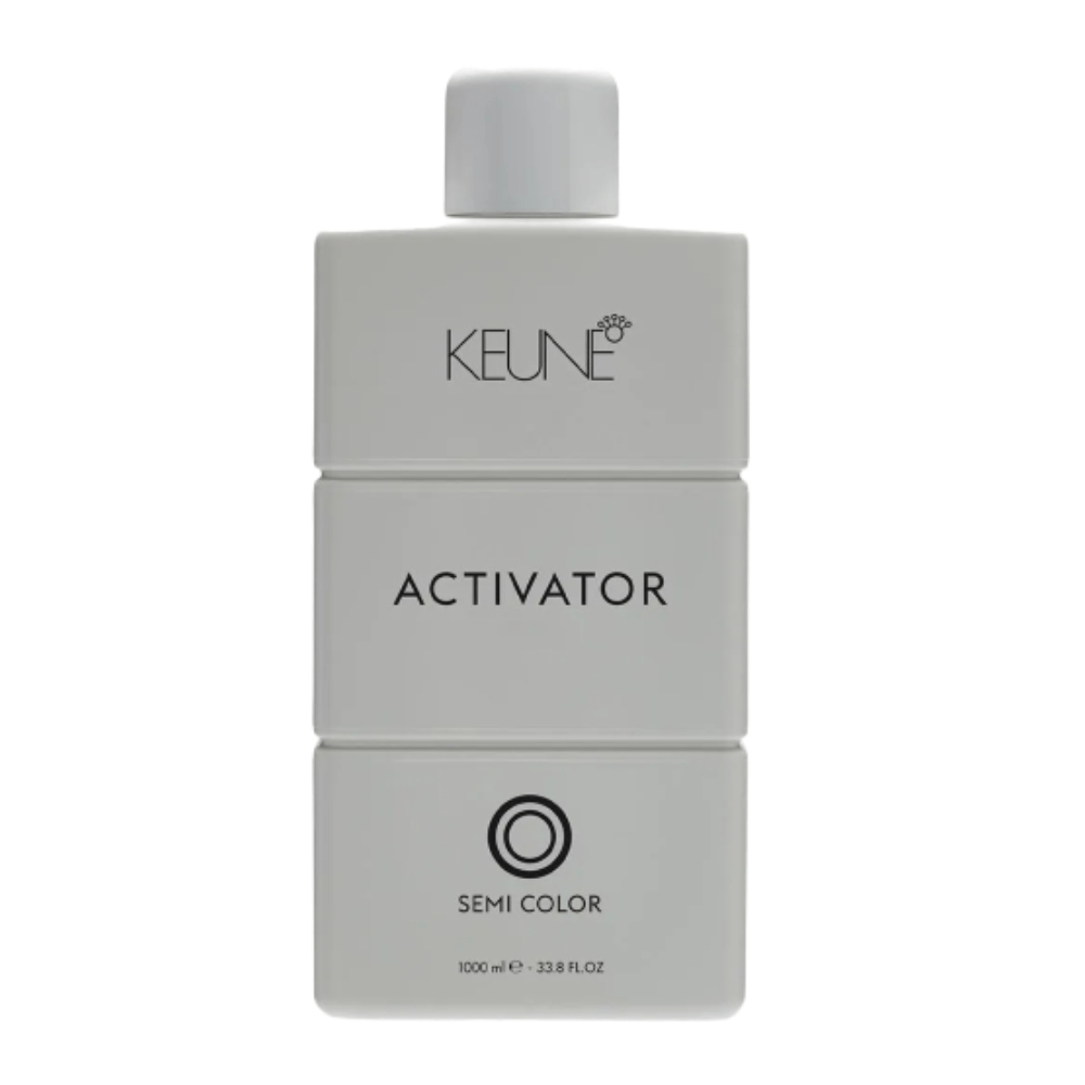 Activador oxidante Keune Semi Color 1000ml com fórmula sem amônia que protege a fibra capilar e preserva o brilho durante a coloração. Textura líquida para mistura homogênea, embalagem ergonômica e rendimento profissional, ideal para uso em salões e aplicações múltiplas.