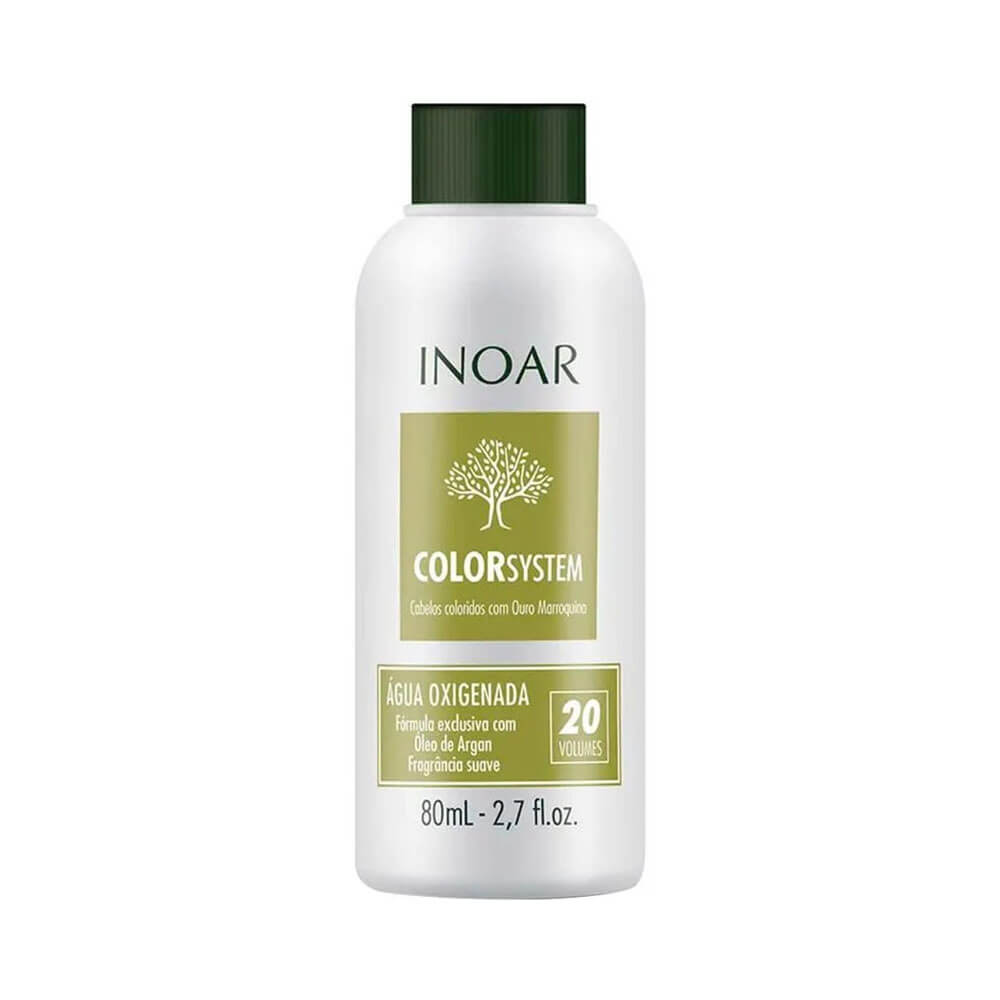 Água Oxigenada Inoar Color System 20 volumes em frasco de 80ml com fórmula enriquecida com óleo de argan. Proporciona clareamento controlado, proteção e hidratação da fibra capilar durante a coloração, garantindo cobertura uniforme, brilho intenso e acabamento suave.