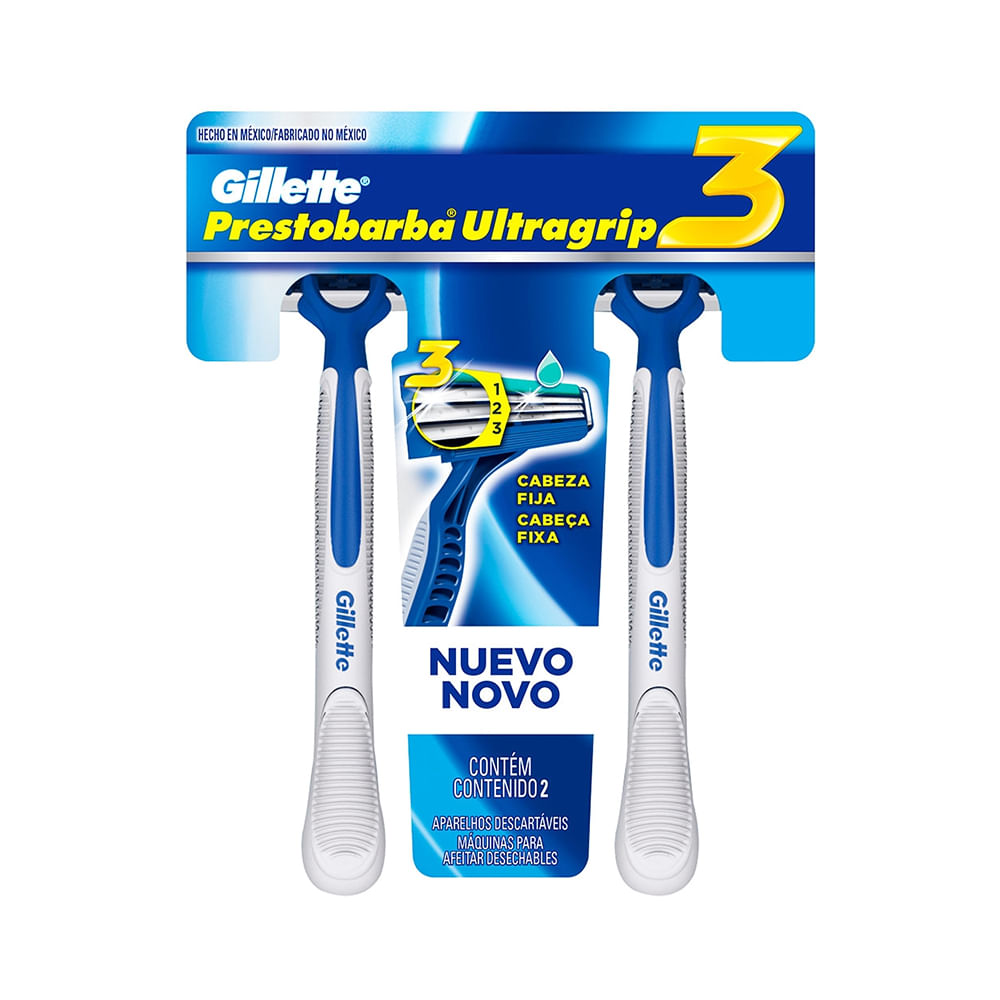 Aparelho descartável Gillette Prestobarba Ultragrip 3 com 2 unidades para um barbear rente, prático e confortável. Conta com três lâminas alinhadas para corte eficiente com menos passadas e cabo antiderrapante para maior controle. Ideal para uso diário e viagens, oferecendo precisão e segurança em cada passagem.