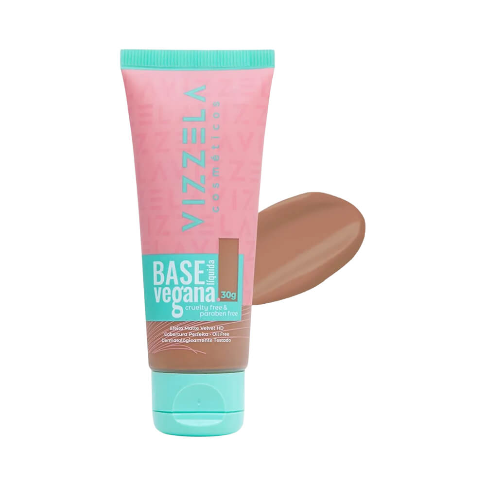 Base líquida vegana Vizzela com acabamento matte e textura aveludada Velvet HD. Fórmula oil free e cruelty-free que oferece cobertura construtível, controle de oleosidade e sensação leve na pele. Embalagem prática com bico dosador e compromisso sustentável para uso diário.