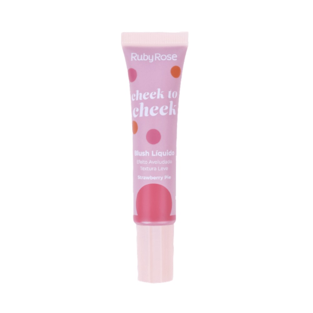 Blush líquido Ruby Rose Cheek To Cheek em tom Strawberry: textura aveludada e fórmula leve que oferece acabamento luminoso, cor modulável e secagem rápida. Embalagem compacta para retoques práticos na bolsa, resultando em aspecto natural e duradouro.