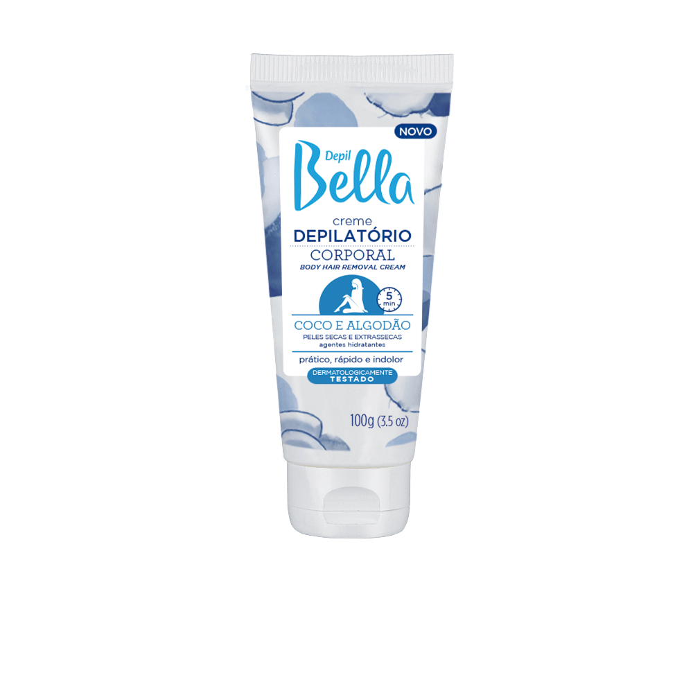 Creme depilatório corporal Depil Bella com fragrância suave de coco e algodão. Fórmula enriquecida que hidrata e suaviza a pele enquanto remove os pelos em apenas 5 minutos. Dermatologicamente testado, oferece depilação prática, segura e acabamento macio e perfumado.