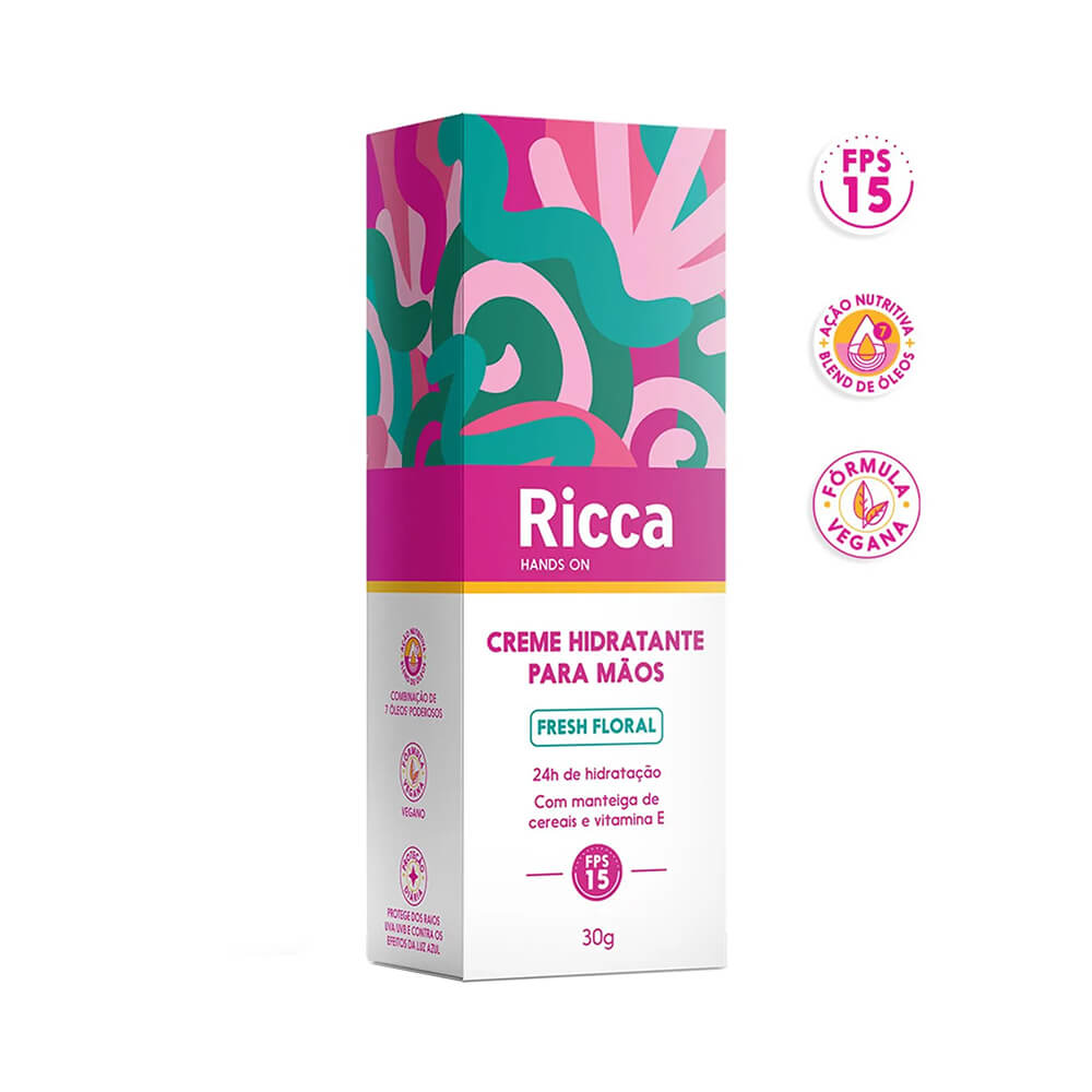 Hidrate e proteja suas mãos com o Creme Ricca Fresh Floral: 24h de hidratação, FPS 15 e fórmula vegana enriquecida com manteiga de cereais e vitamina E. Leve fragrância floral e rápida absorção para uso diário.