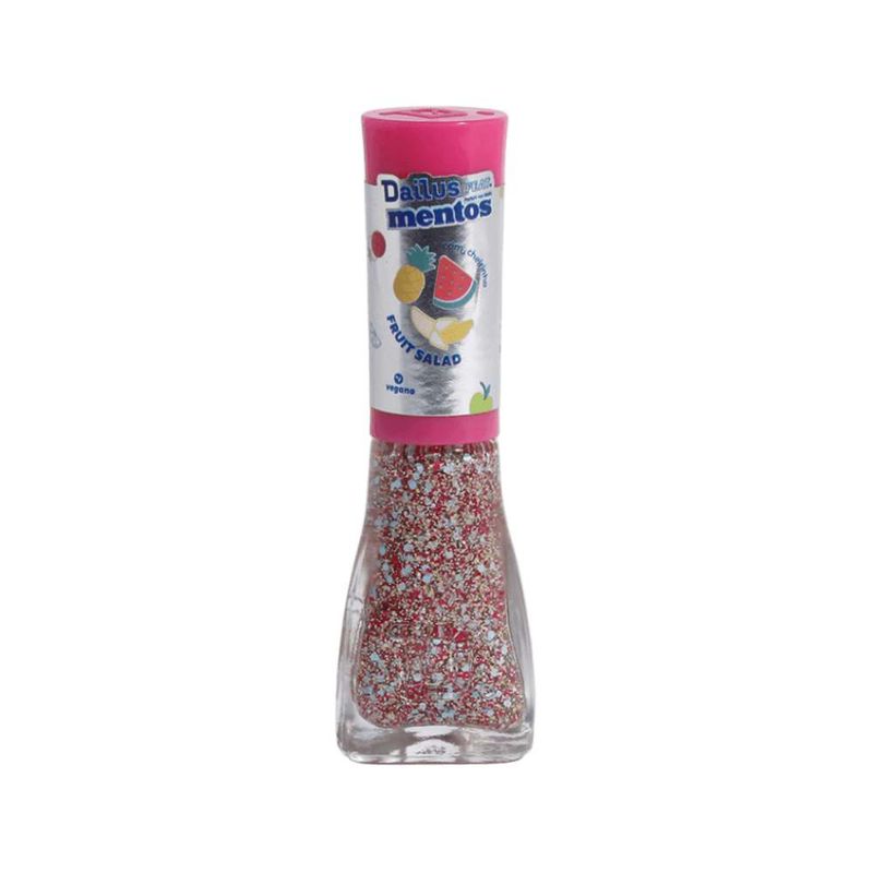 Esmalte glitter Dailus Mentos Fruit Salad que traz partículas multicoloridas para unhas vibrantes e cheias de personalidade. Fórmula vegana, secagem rápida e pincel macio garantem aplicação prática, brilho intenso e acabamento festivo em poucos minutos.