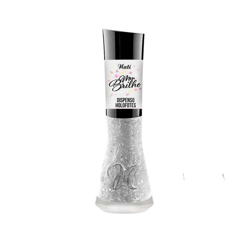 Esmalte holográfico Nati com acabamento prateado e partículas reflexivas que garantem brilho intenso e sofisticação. Fórmula vegana e livre de toxinas para unhas mais saudáveis e look duradouro.