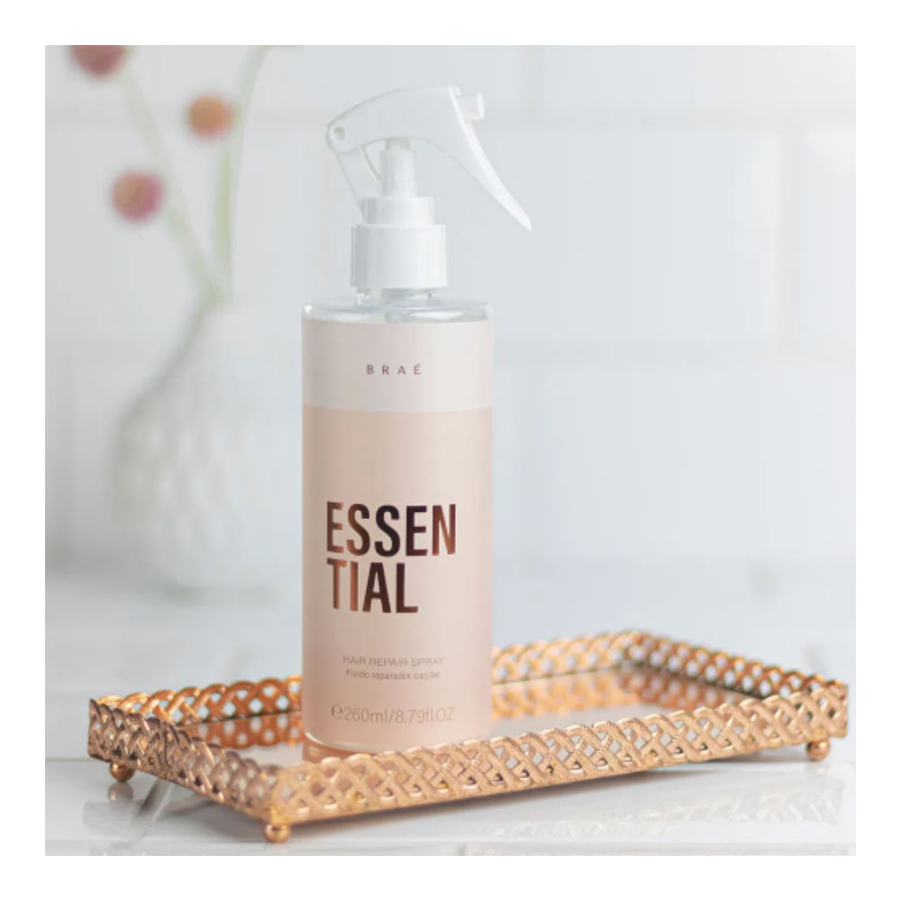 Finalizador Braé Essential 260ml que repara, hidrata e protege os fios do calor diário. Fórmula com ácido hialurônico, monoi oil, pantenol e blend de aminoácidos para reduzir o frizz, devolver maciez e proporcionar acabamento sedoso com aplicação prática em spray.