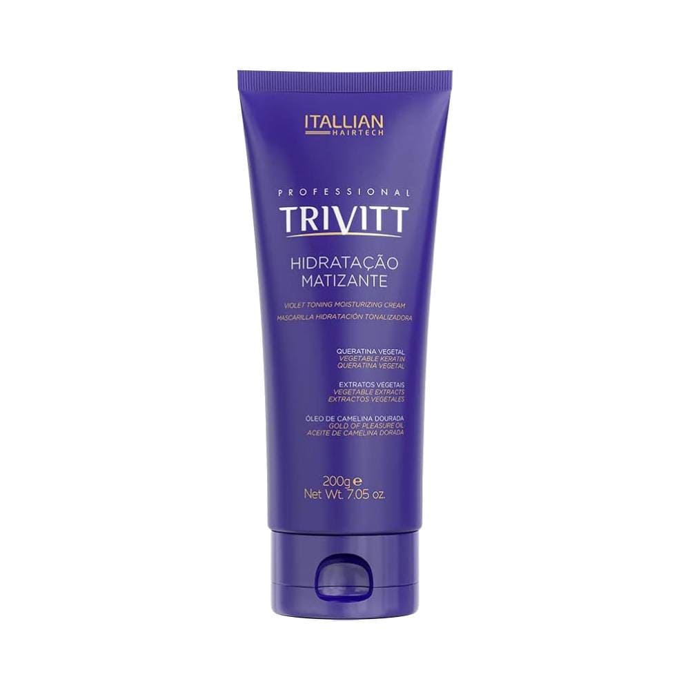 Máscara matizante Trivitt que hidrata profundamente e neutraliza tons amarelados em cabelos loiros e descoloridos. Fórmula com queratina hidrolisada, extratos vegetais e óleo de camelina para maciez, brilho platinado e proteção da fibra capilar.