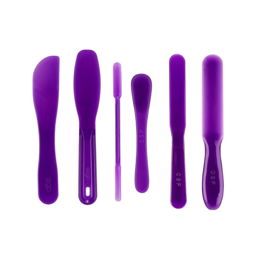 Conjunto com 6 espátulas Gianinis na cor uva, em plástico PP resistente. Ideal para confeitaria e uso culinário, oferece design ergonômico, variedade de formatos e fácil limpeza — compatível com lava-louças e resistente a altas temperaturas para uso diário com praticidade.