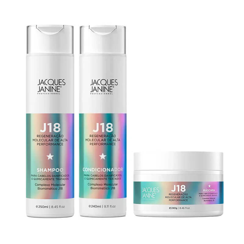 Kit completo Jacques Janine J18 para recuperação intensiva de cabelos danificados e quimicamente tratados. Com Complexo Biomimético J18, reconstrói a fibra capilar, devolve força, elasticidade e brilho desde a primeira aplicação. Embalagens práticas para uso diário e resultados profissionais em casa.