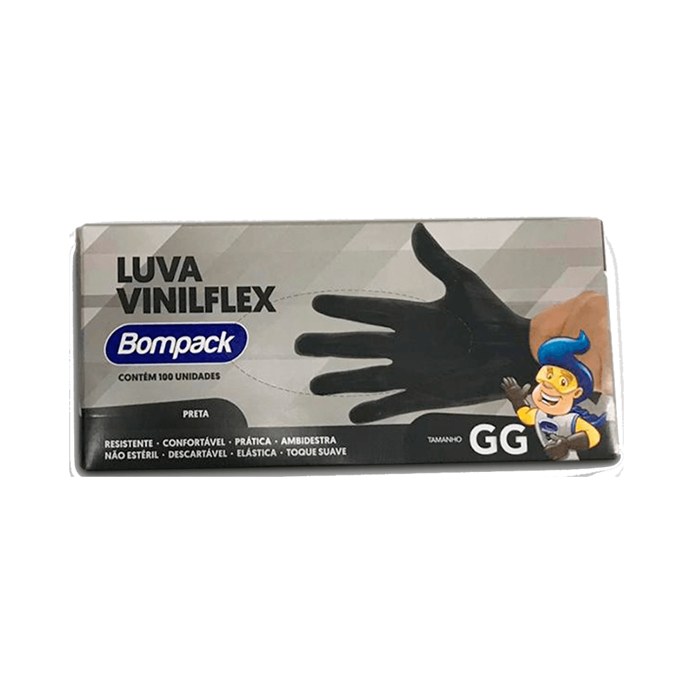 Luva descartável Bompack Vinilflex em vinil resistente, pack com 100 unidades no tamanho GG. Oferece proteção, toque sensível e conforto para manipulação de alimentos e tarefas de limpeza, combinando discrição da cor preta com praticidade para uso doméstico e profissional.