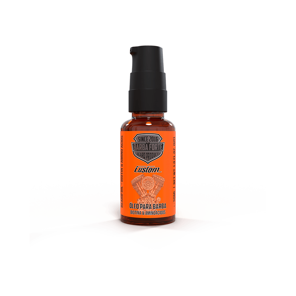 Óleo para Barba Custom Barba Forte hidrata e fortalece os fios com biotina e aminoácidos. Textura leve de rápida absorção que deixa a barba macia, com brilho controlado e sem sensação oleosa. Frasco com válvula pump para dosagem precisa e aplicação prática no cuidado diário.
