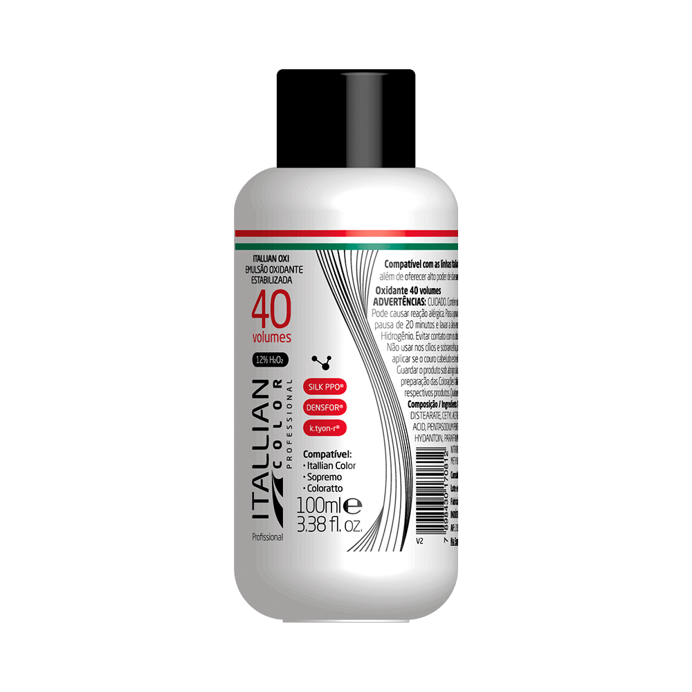 Emulsão oxidante Itallian 40 volumes (12% H2O2) em embalagem de 100ml. Fórmula estabilizada e textura cremosa que garante aplicação precisa, clareamento intenso e proteção dos fios durante processos de coloração e descoloração profissionais.