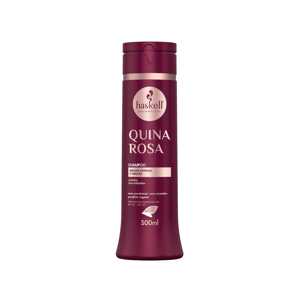 Shampoo Haskell Quina Rosa 300ml desenvolvido para recuperar cabelos descoloridos e danificados. Fórmula vegana e sem parabenos que limpa com suavidade, nutre profundamente e devolve brilho e maciez desde a primeira aplicação, fortalecendo a fibra capilar com extrato de quina e pH balanceado.