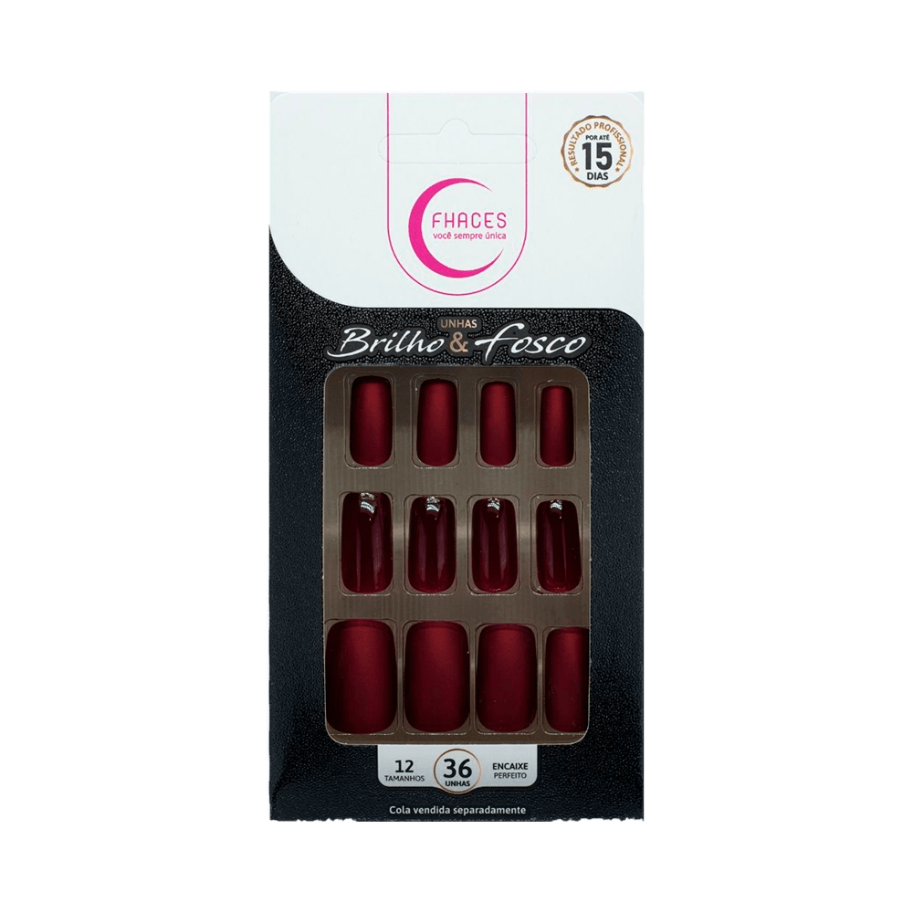 Unhas postiças Fhaces no tom vinho com acabamento dual (brilho e fosco). Pacote com 36 unidades em 12 tamanhos para encaixe perfeito, aplicação rápida e resultado sofisticado por até 15 dias. Ideal para quem busca praticidade e estilo.