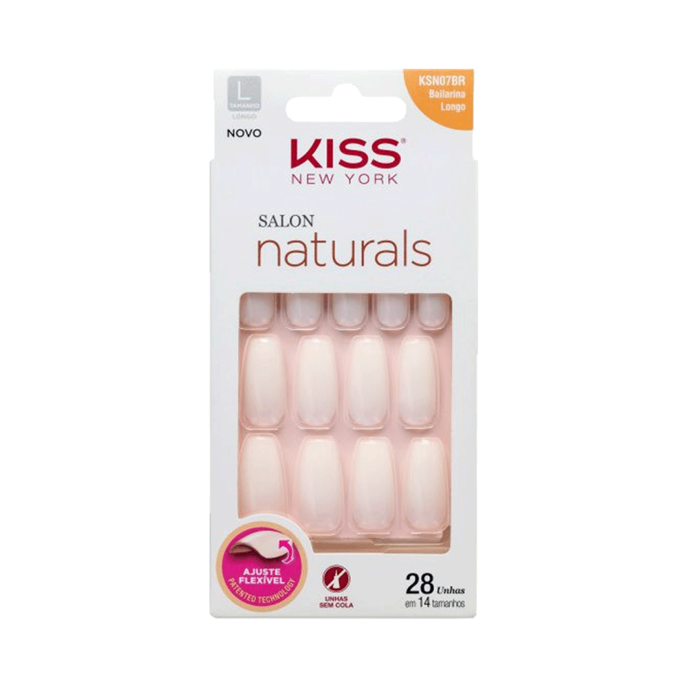 Unhas postiças Kiss New York Salon Natural Bailarina que oferecem praticidade e acabamento profissional em minutos. Pacote com 28 unidades em 14 tamanhos para ajuste personalizado, material resistente e tecnologia flexível que garante conforto e fixação. Formato bailarina e tonalidade neutra ideais para usar como estão ou personalizar com esmalte.